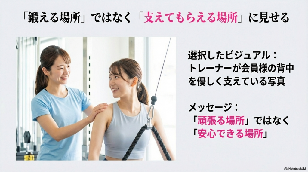 数ある素材の中から選んだのは、トレーニング中の写真ではなく、**「トレーナーが会員様の背中を優しく支えている写真」**です。