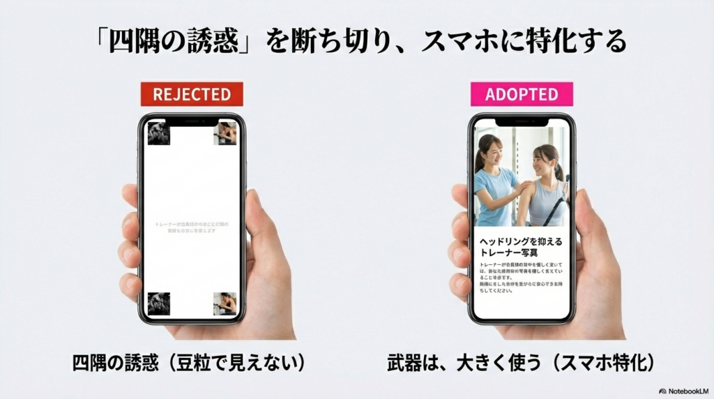 ターゲットはスマホユーザーがメイン。小さな画面で写真が豆粒のようになってしまっては、最大の武器である「トレーナーの優しい表情」も「店内の清潔感」も伝わりません。