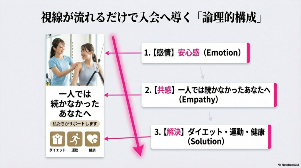 「ターゲットは運動が続かない初心者の方です。だから、安心感や優しさを伝えたい。デザインはシンプルで、落ち着いたトーンでお願いします」