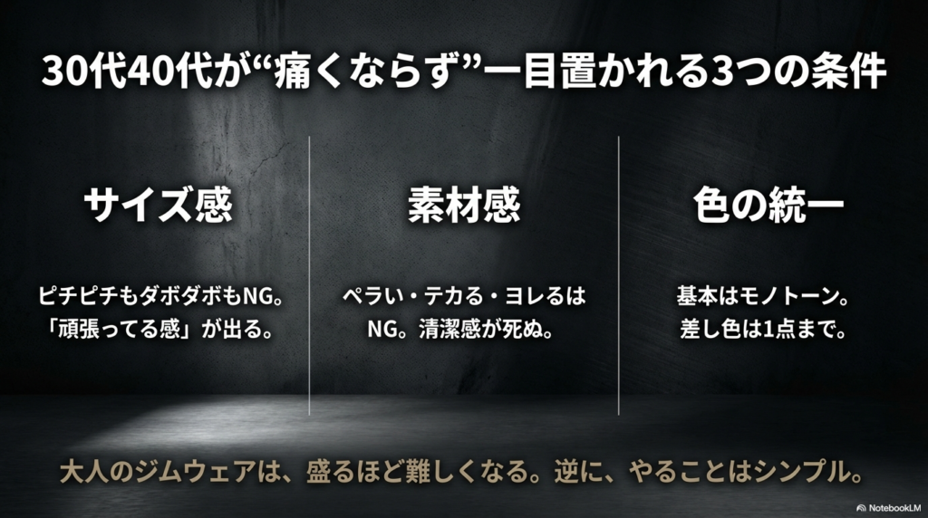 - サイズ感:ピチピチもダボダボも避ける(“頑張ってる感”が出る)