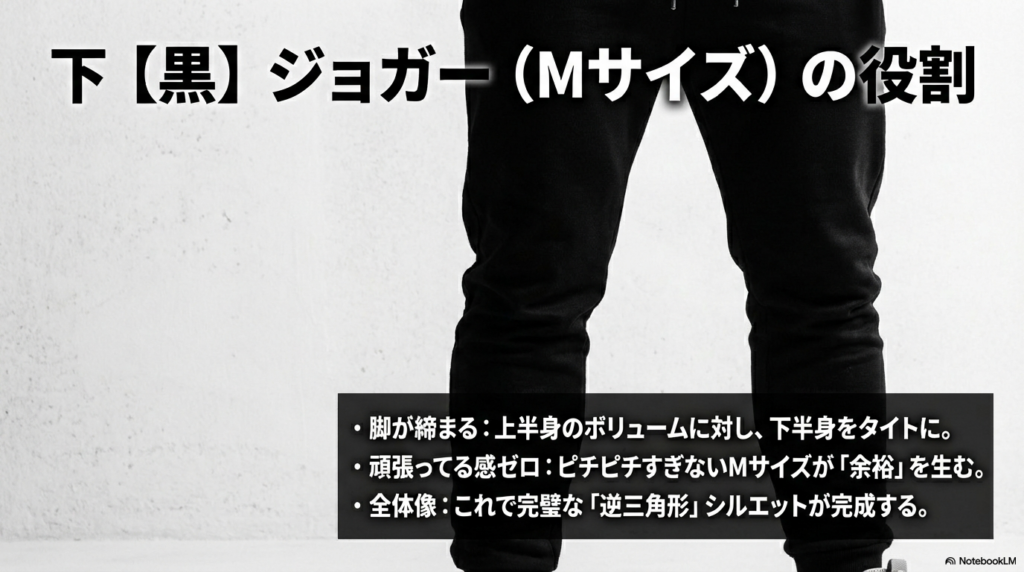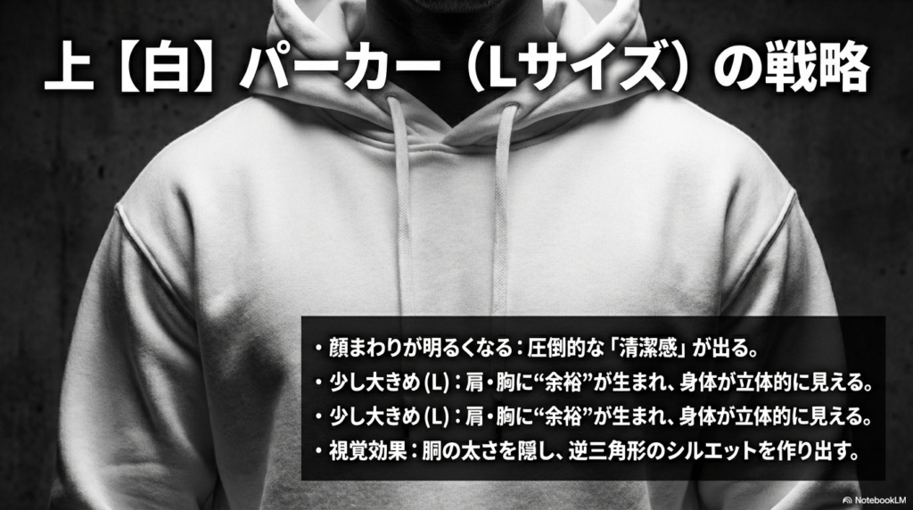A. 僕は「白パーカーL(少し大きめ)×黒ジョガーM(タイト)」が一番カッコいいと感じています。上で余裕、下で締めるのがコツ。