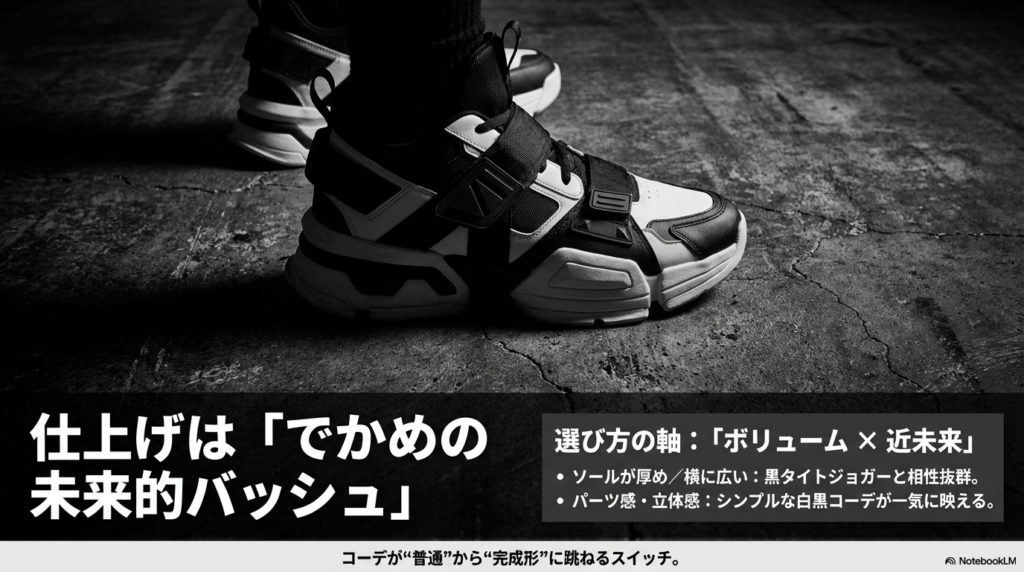 そのバランスを一発で作れるのが、この白×黒×未来的バッシュ。