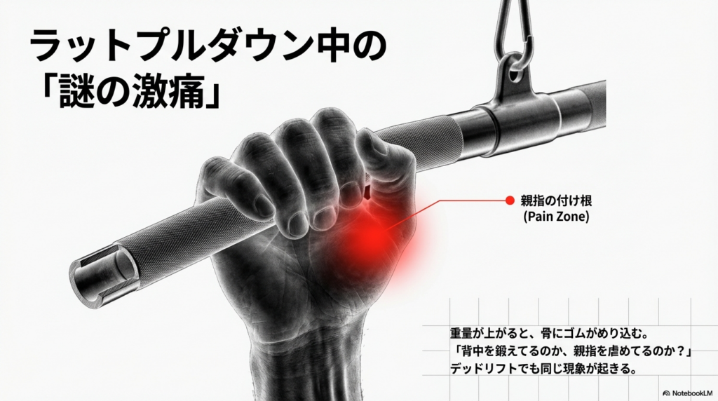 - ラットプルのたびに親指の付け根の骨にグリップがめり込んで痛い