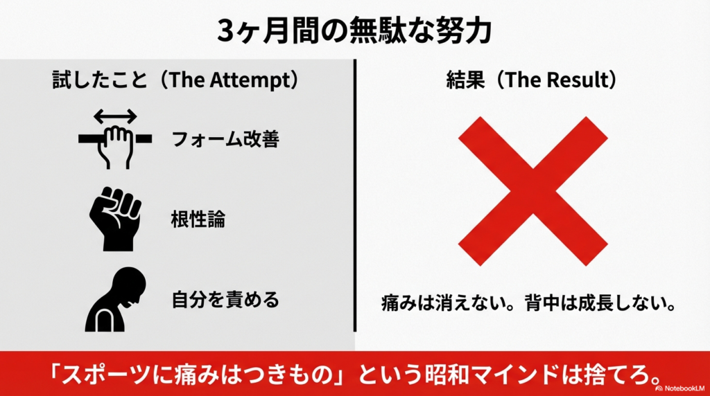 今、背中の日が来るたびにグリップの痛みと格闘してるなら、それはもうやめにせえ。その痛みに使っとるエネルギーを、全部広背筋にぶつけろ。